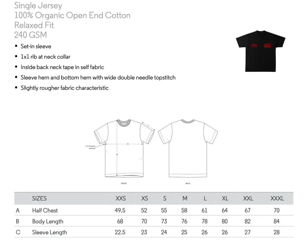 The shirt is made from 240gsm heavyweight cotton with an oversized fit, featuring red-printed designs.